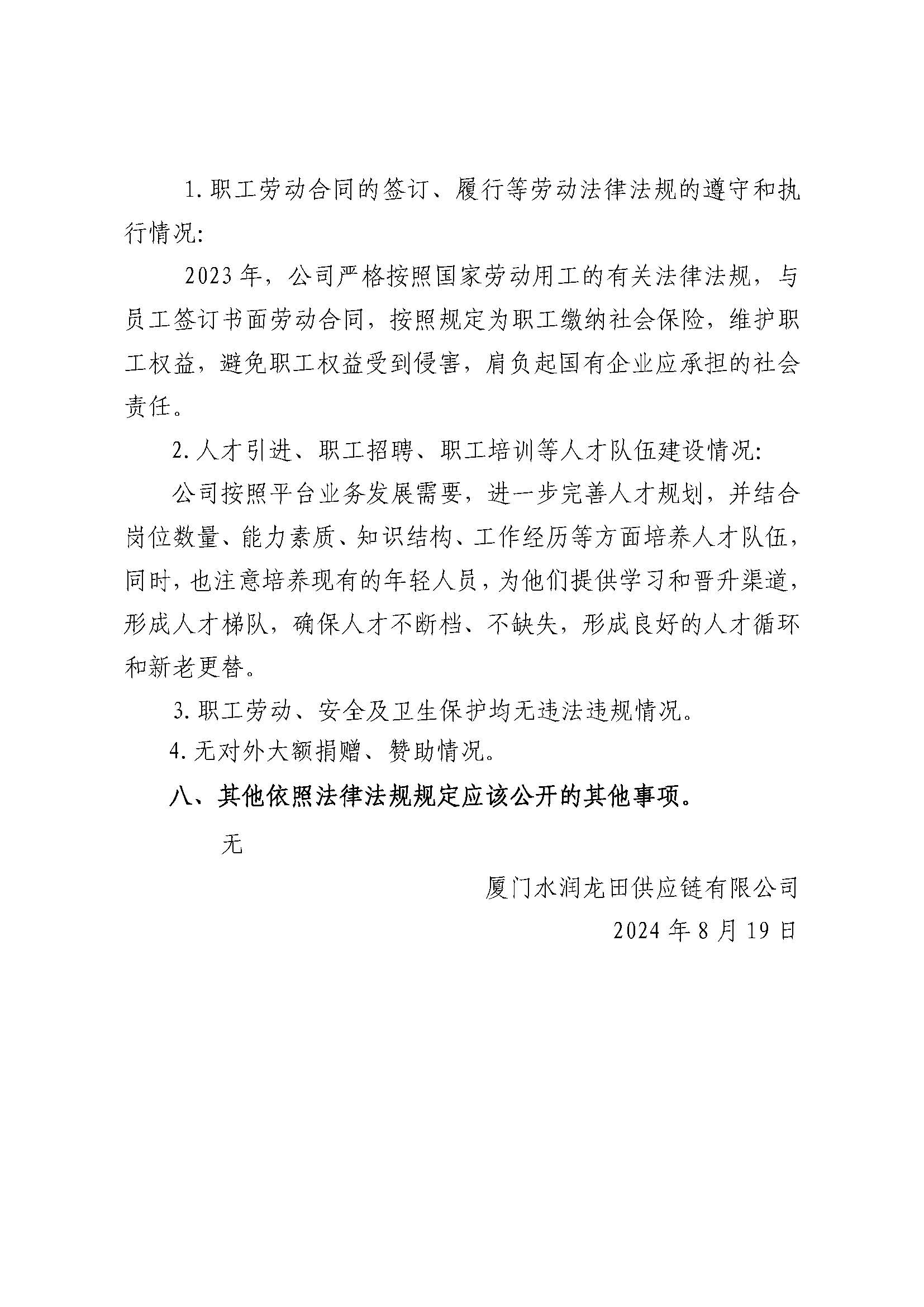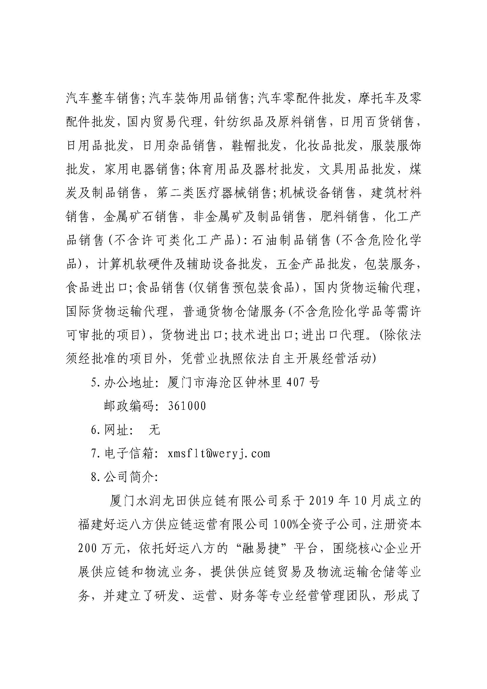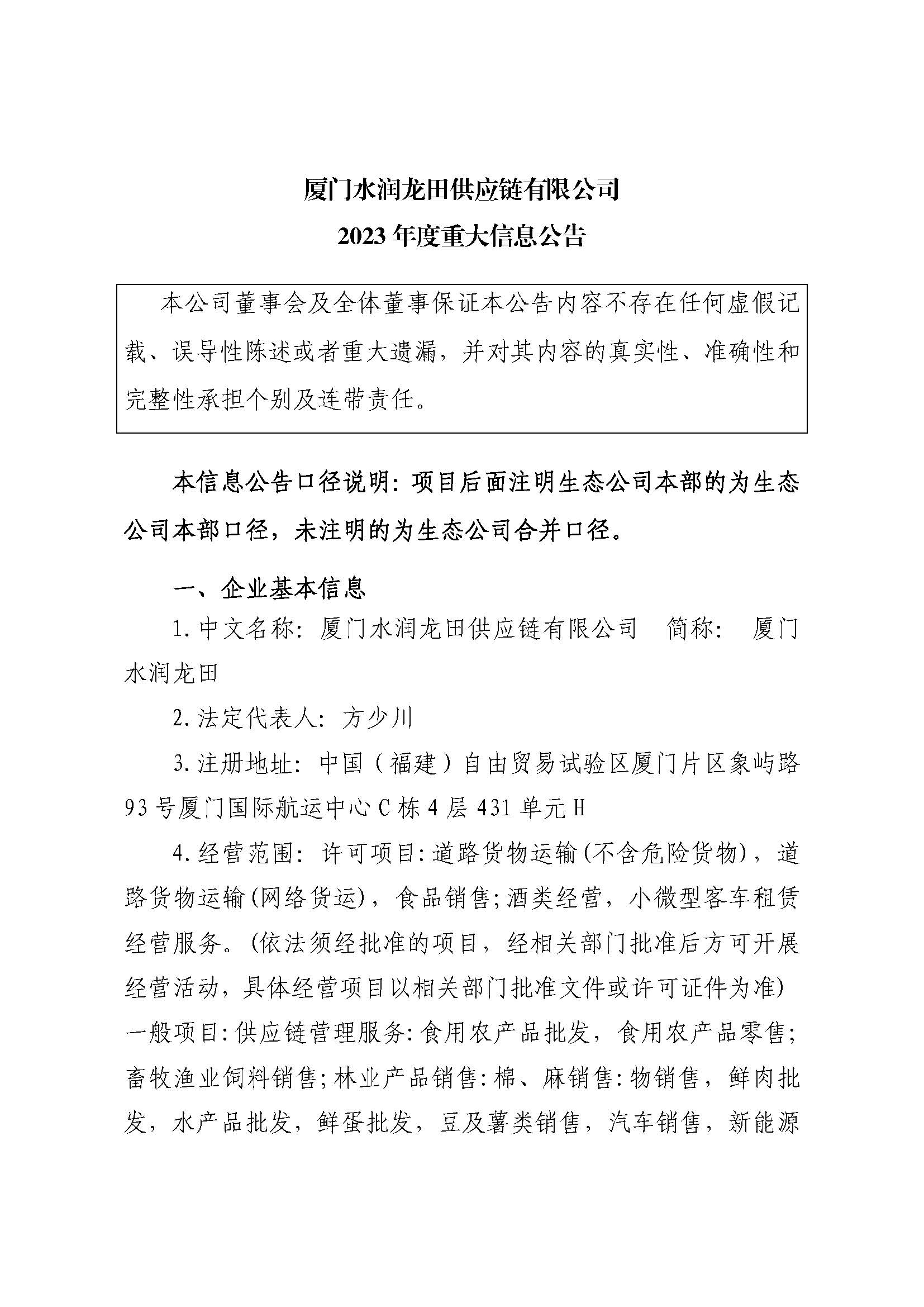厦门水润龙田供应链有限公司2023年度重大信息公告