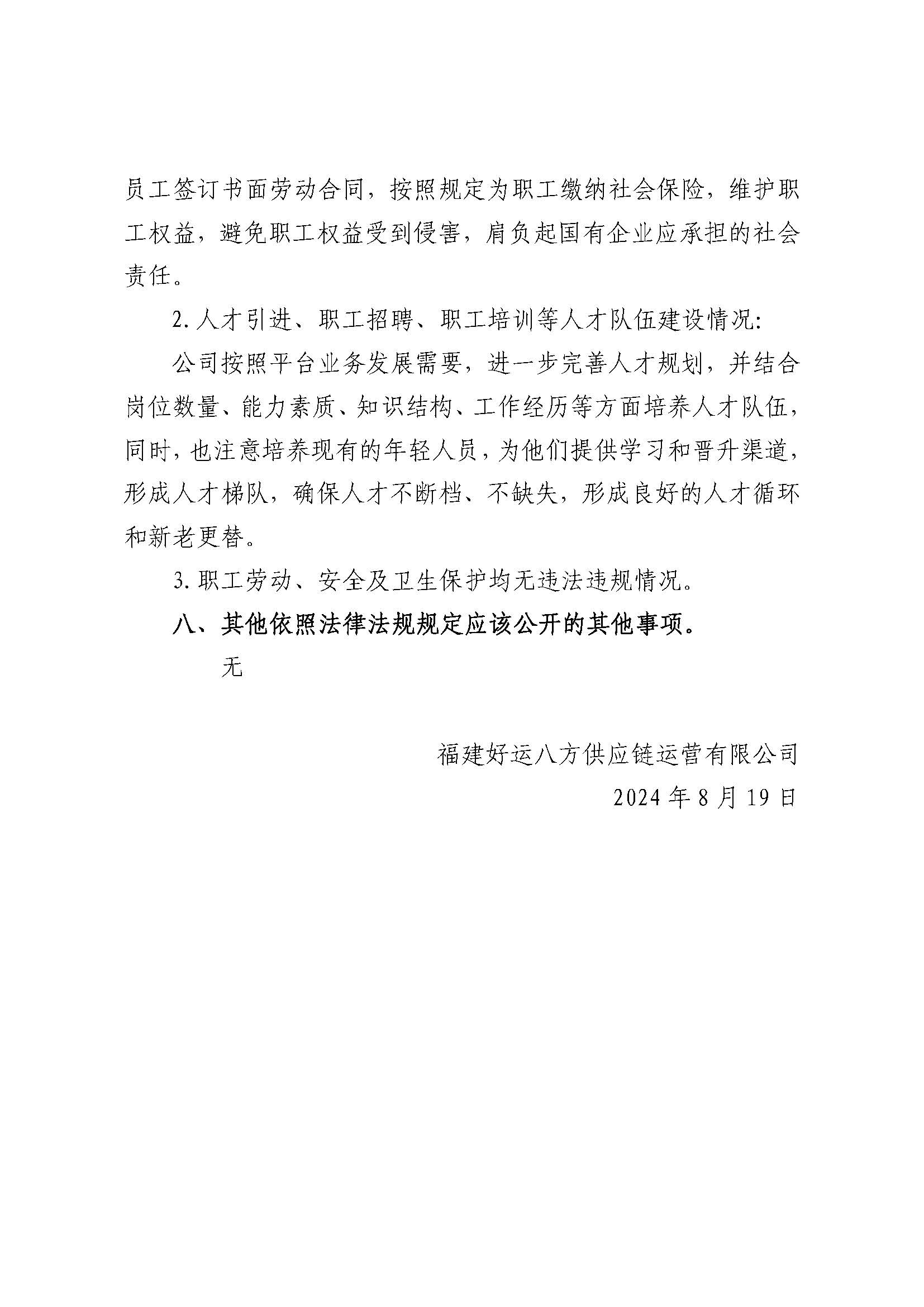 福建好运八方供应链运营有限公司2023年度重大信息公告