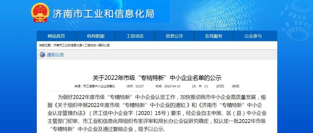 近日,济南市工业和信息化局2022年市级“专精特新”中小企业公示期结束,水发(山东)检验检测研究院有限公司成功入选2022年市级“专精特新”中小企业。这是继获得国家级高新技术企业认证后,公司获得的又一重要权威认证。